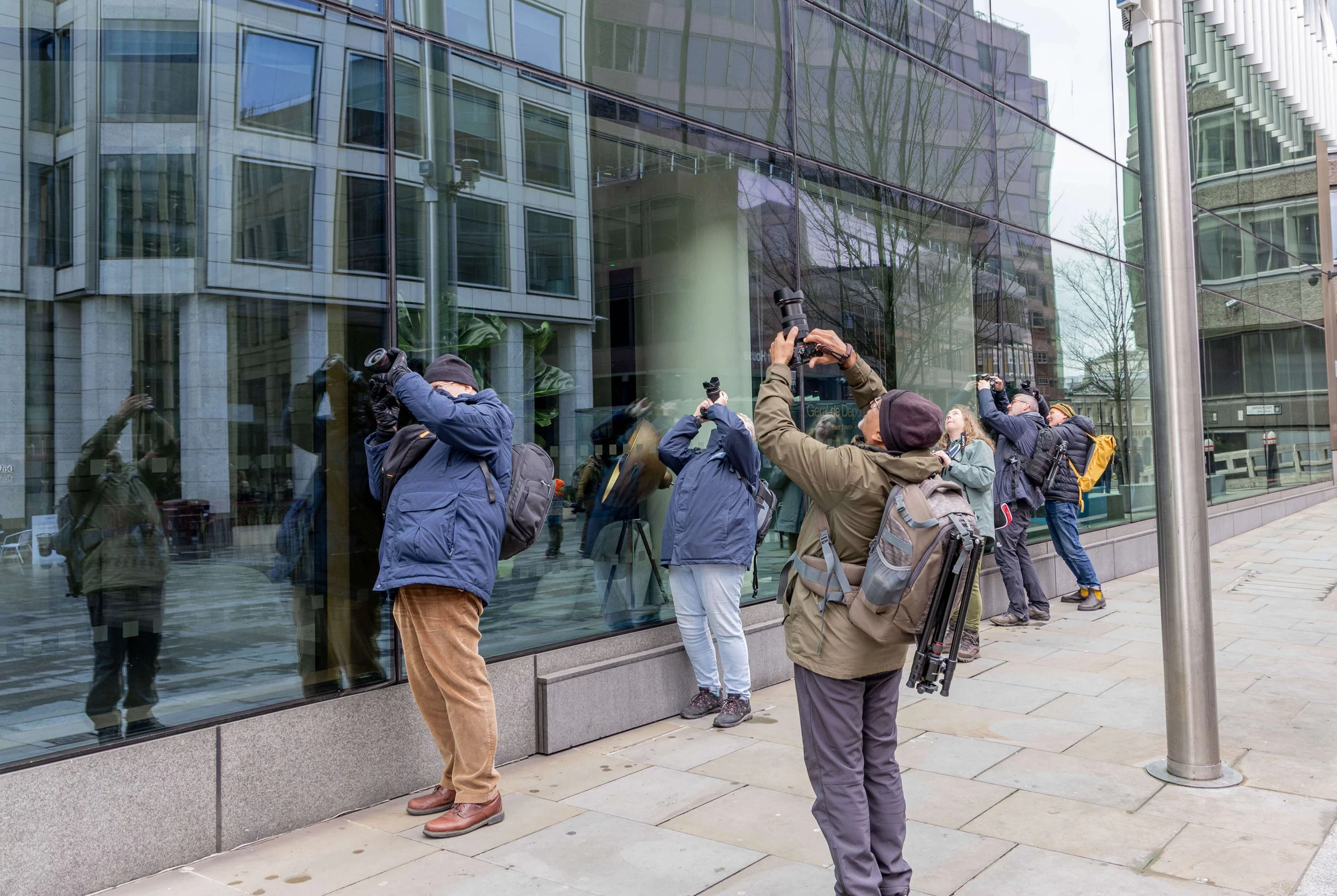 On a cold and slightly rainy Sunday, 12 members of the club met outside the Gherkin to go on an architecture photo walk through the City of London. As we were waiting for few members to arrive we fleetingly saw an urban fox rush past who was taking advantage of the quiet in what through the week are usually very busy streets. Members learnt a lot during the course of the day including how to carry out multiple exposures, slow shutter speeds and setting up the camera for some night Photography. Tripods were in use in locations where permitted but mostly the shots are handheld.